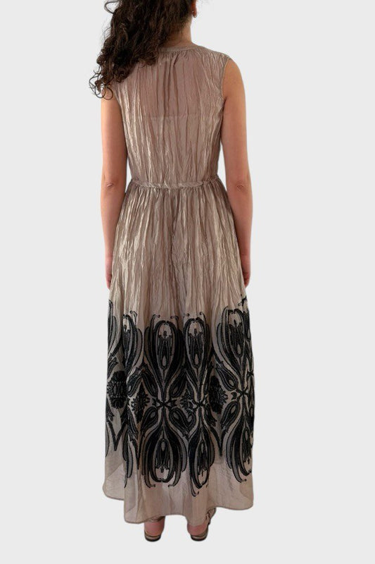 Abito lungo Psophia beige con ricamo nero