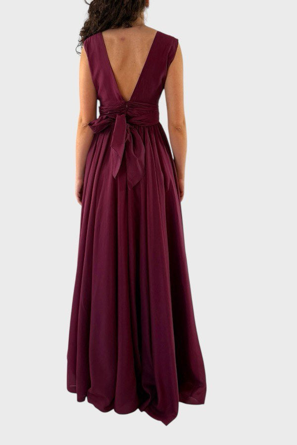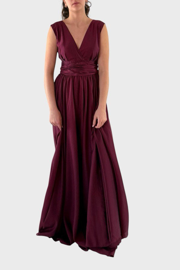 Abito lungo dal design elegante e femminile, caratterizzato da scollo a V profondo e vita segnata con fascia drappeggiata. La gonna ampia e fluida dona movimento e raffinatezza, mentre la schiena scoperta aggiunge un tocco sensuale. Perfetto per cerimonie ed eventi speciali.