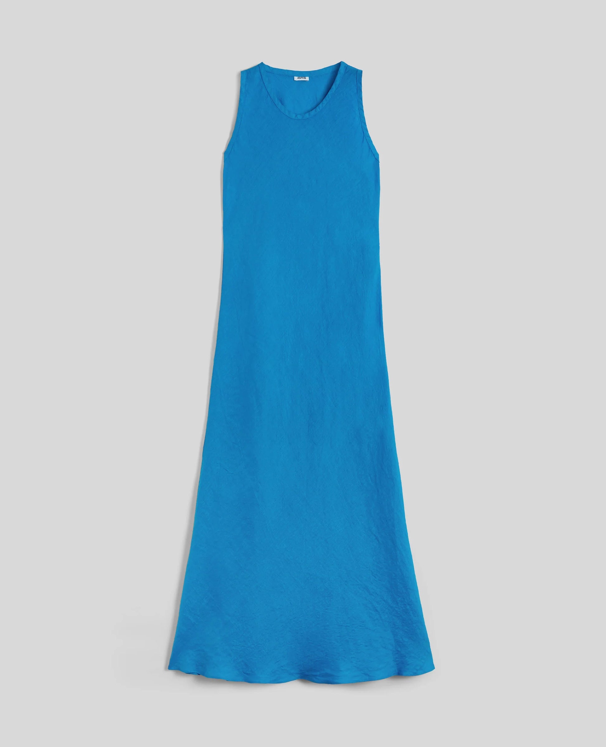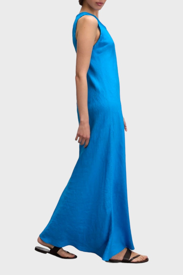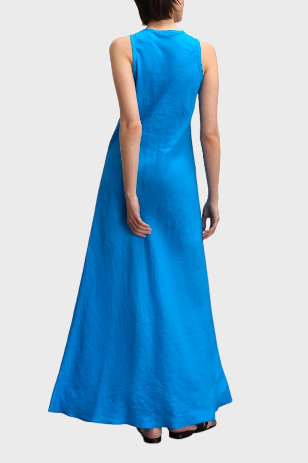 Abito lungo realizzato in lino leggero tinto in capo. Modello sfoderato e smanicato, dalla vestibilità regolare.