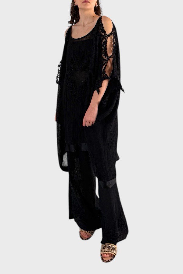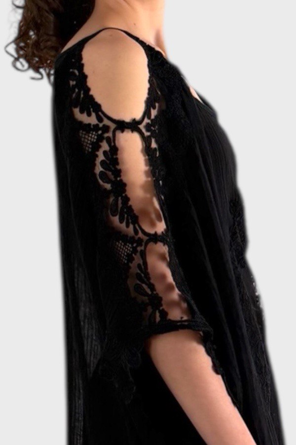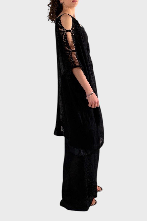 Caftano in lino , maniche 3/4 con inserti di pizzo, oro asimmetrico rifinito con raso nero
