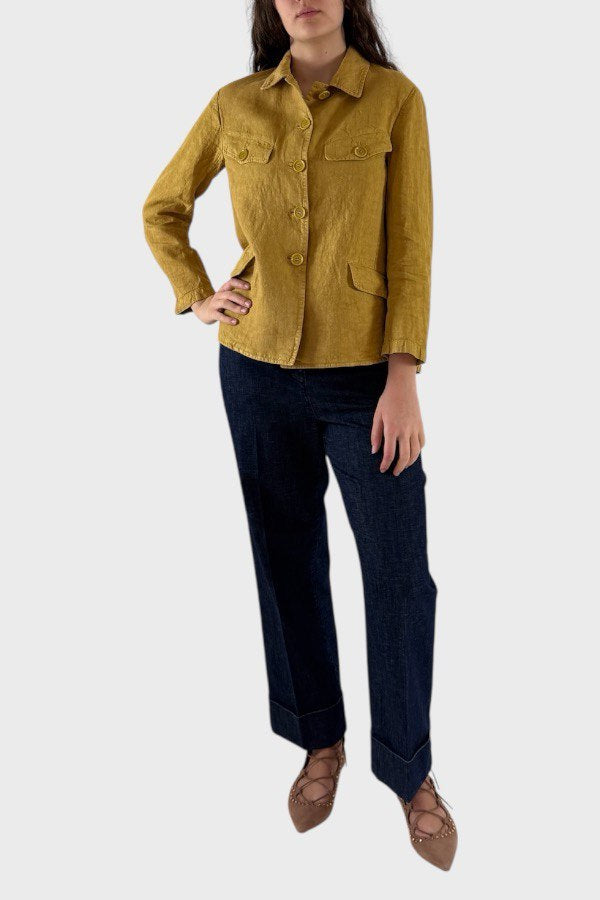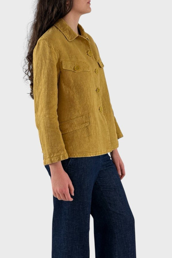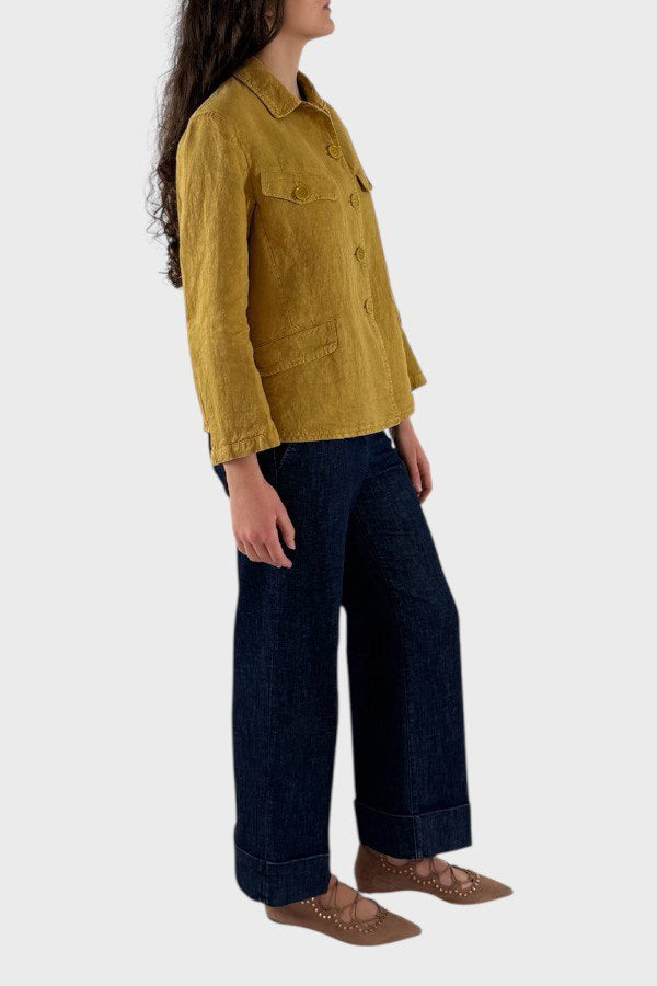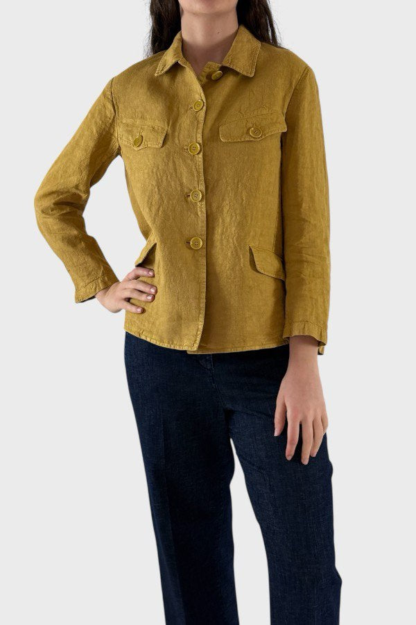 Giacca in lino dalla trama leggera e traspirante, ideale per la stagione estiva. Realizzata in puro lino di qualità, presenta una tonalità di giallo senape che si adatta perfettamente alle palette calde. Il colletto strutturato e i bottoni in tono conferiscono eleganza senza compromessi. Un capo versatile che combina praticità e stile, perfetto per look casual raffinati o abbinamenti più formali in contesti estivi.