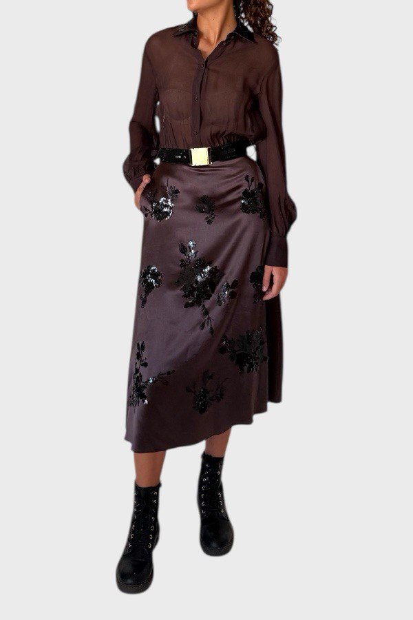 Gonna longuette in raso con fiori di paillettes, elastico in vita.